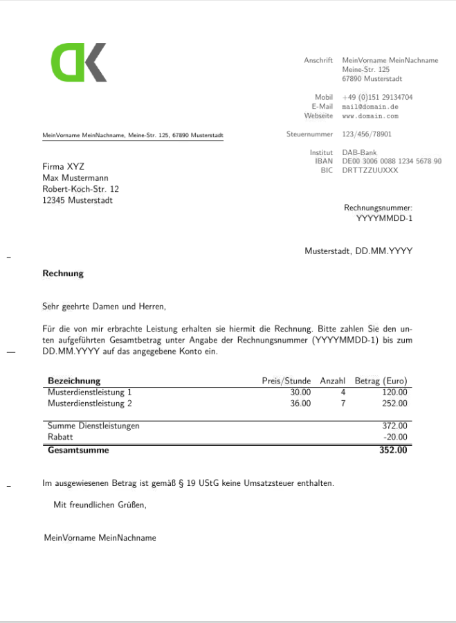 In dieser Latex Rechnungsvorlage wird das alles unterstützt!